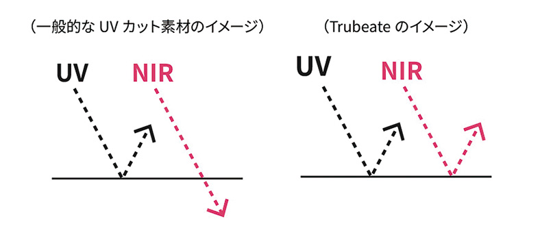 紫外線は主に肌表面にダメージを与えるが、近赤外線は体の内部にまで届き、深部体温の上昇を引き起こす要因になる。そのため、表面も防ぎ、内部に届く熱も防ぐ二重の設計が必要だと考えた。近赤外線を吸収する『SOLAMENT®』を練り込んだ糸と、紫外線を反射する酸化チタンを練り込んだ糸を組み合わせた、高機能繊維『トゥルーボーテ®』を採用している。